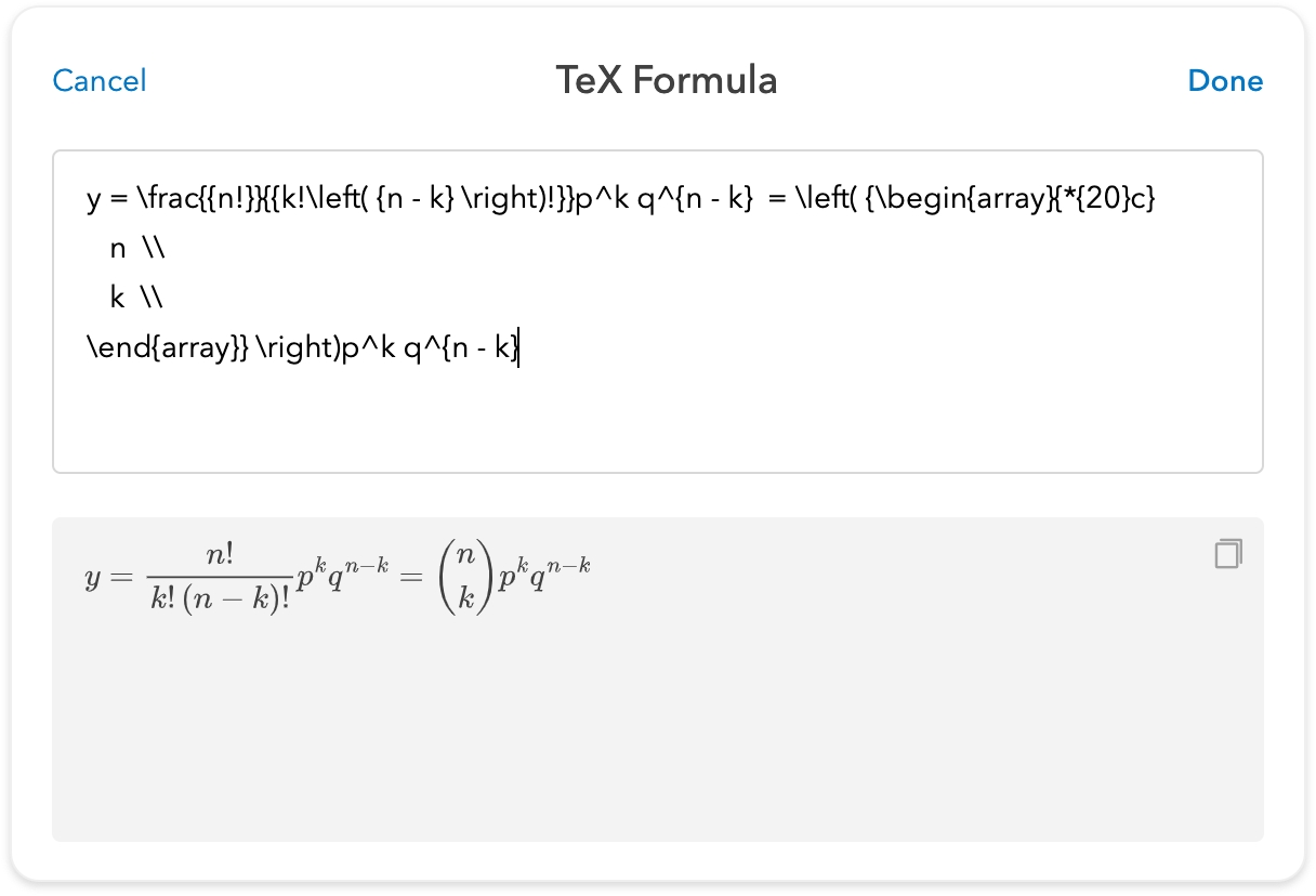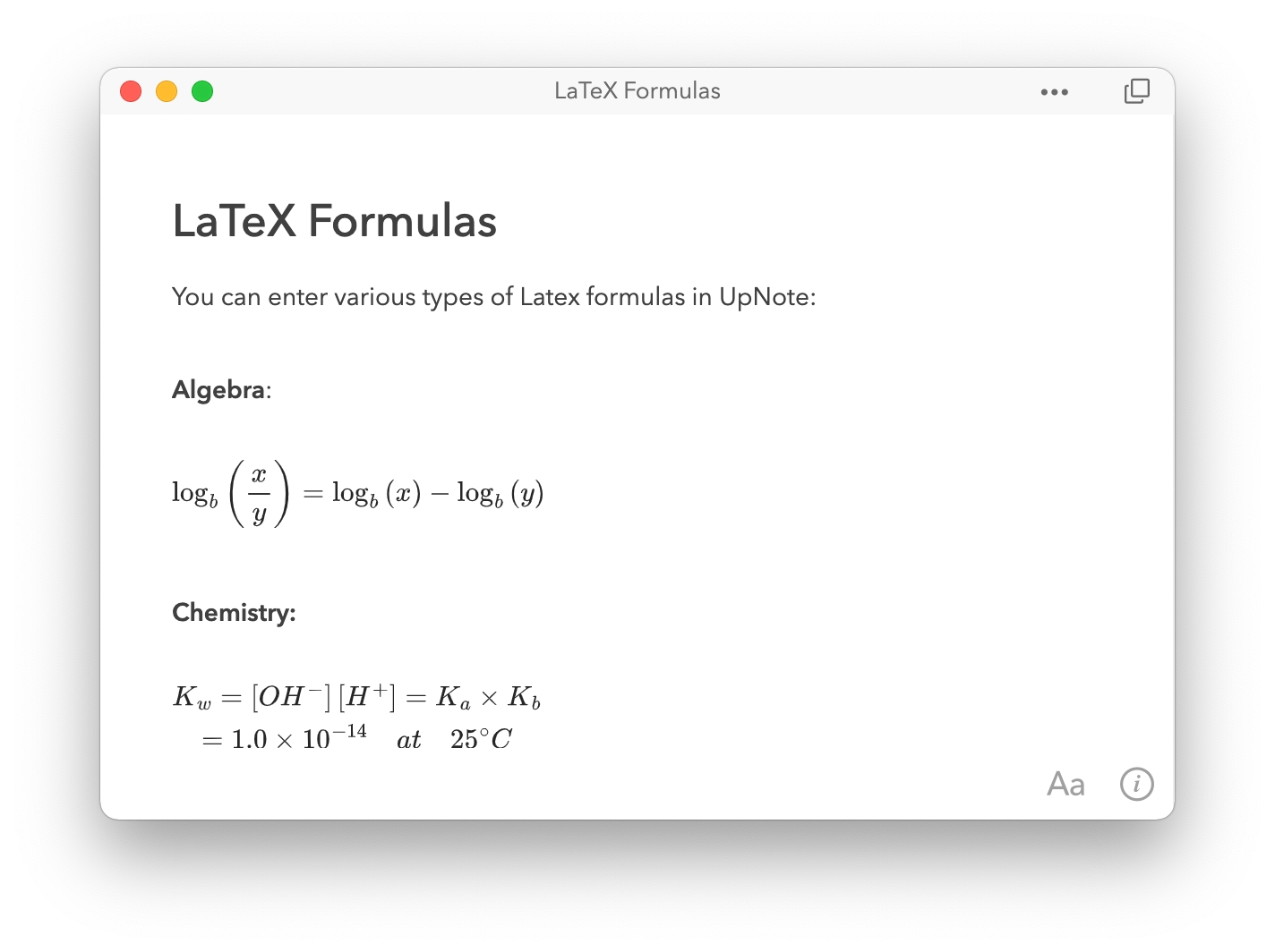 To insert LaTeX formulas, you can click or tap the TeX formula icon in the formatting bar or use the shortcut Ctrl/Cmd + Shift + M on your desktop app.