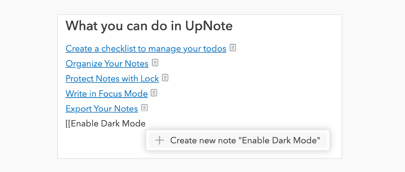 If you want to refer to a note which doesn’t exist yet, simply type the note title and UpNote will create a new note with that title for you.